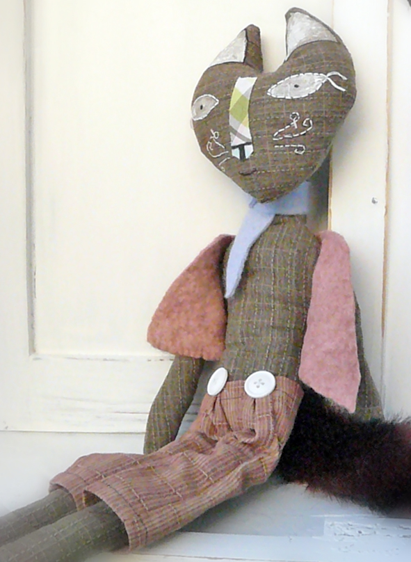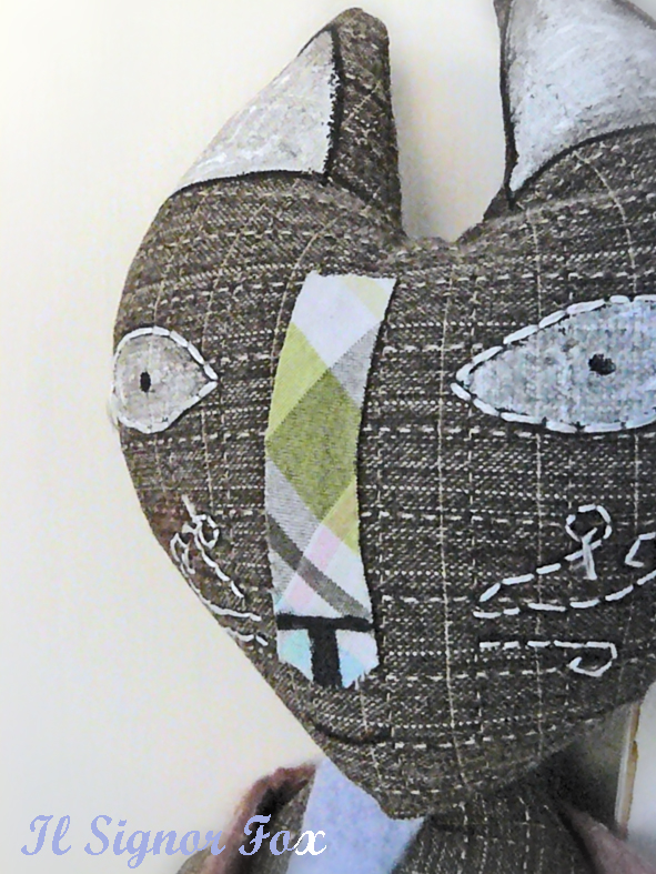 (Il Signor Fox – doll in tessuto giapponese, lana cardata e coda in pelliccia ecologica, ricamato e dipinto a mano, h 45 cm)