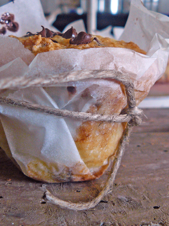 Unire tutti gli ingredienti solidi dopodiché aggiungere tutti gli ingredienti liquidi e mescolare. Versare il contenuto negli stampi, ricoprire con altre gocciole di cioccolato ed infornare a 180° (forno non ventilato) per 30 min.
