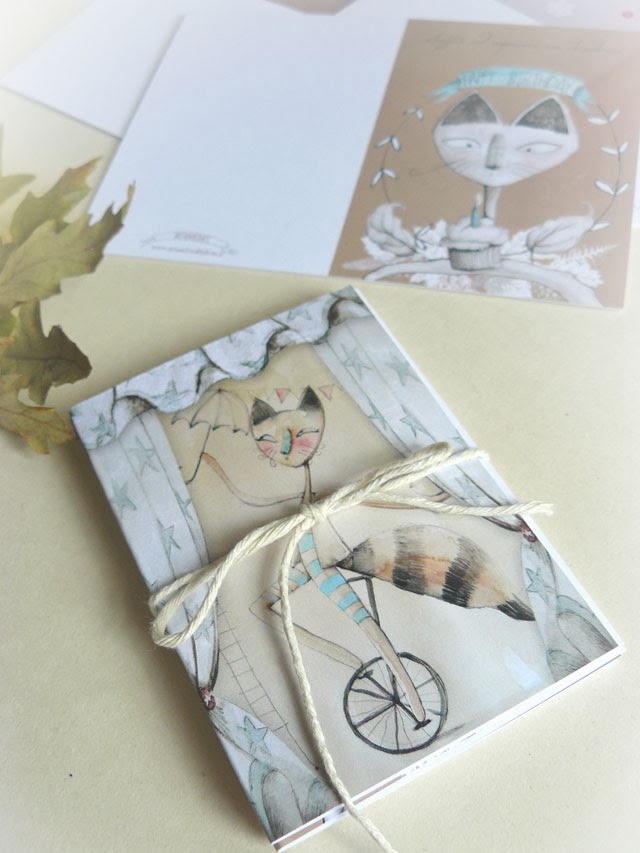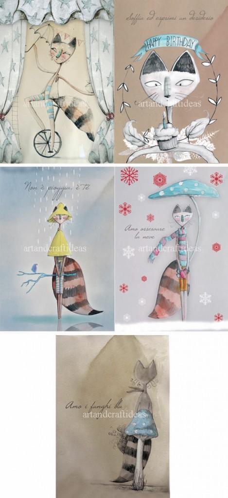 Le illustrazioni per le greeting cards sono cinque, quattro, invece, quelle delle Postcards che, volevo mostrarvi, ma ne ho solo una parte di prova, al momento, il resto sarà pronto tra una decina di giorni.