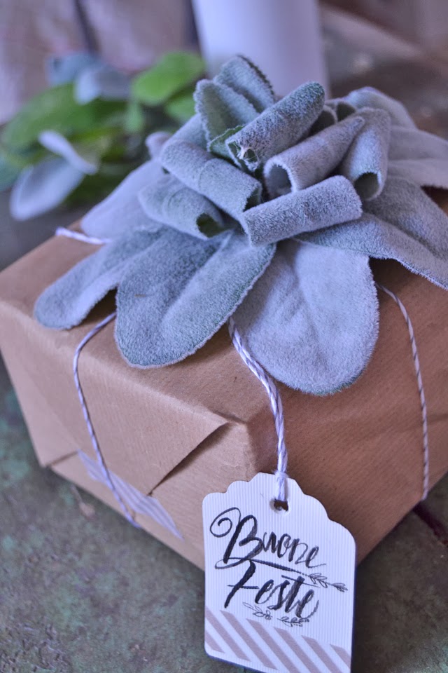 Mi piace tantissimo impacchettare e personalizzare i pacchettini e guardando come Simonetta e Mirco hanno utilizzato il rosmarino per i decori di Natale, io ho pensato di utilizzare la salvia. Amo il suo profumo ed in giardino, qualche foglia ancora decente ed integra dalla lumache l’ho trovata. Mi sono aiutata anche con della salvia sintetica perché non avevo foglie integre e belle a sufficienza. Poi un po’ di colla a caldo ed ho composto la coccarda profumata.