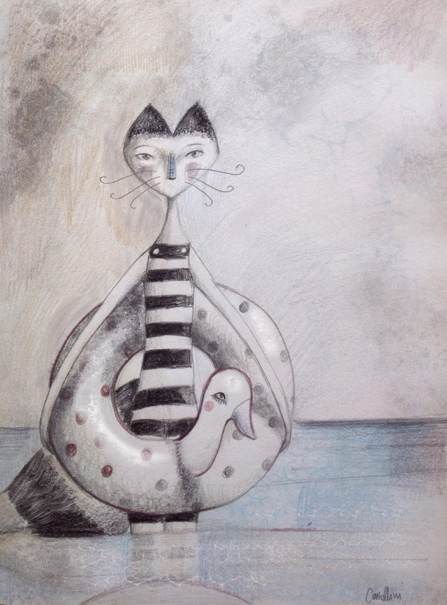 Ve l’avevo detto che ho una papera speciale, quando il tempo è bello la porto anche al mare. Appena sente l’acqua inizia a starnazzare perché ha voglia di nuotare. E siccome non sono un gran nuotatore ma sono alquanto pigrone, lei mi aiuta a galleggiare muovendo la testa con il ritmo del mare. Facendo così io capisco che devo battere i piedi per farla avanzare fino a raggiungere quello scoglio in riva al mare. Invece quando alza la testa vuol dirmi di nuotare verso destra.